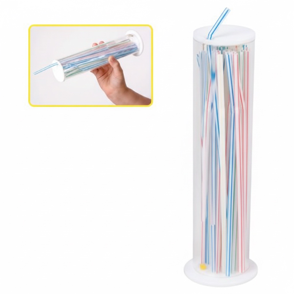 Realizado en tubo de metacrilato incoloro con base y tapa blanca.